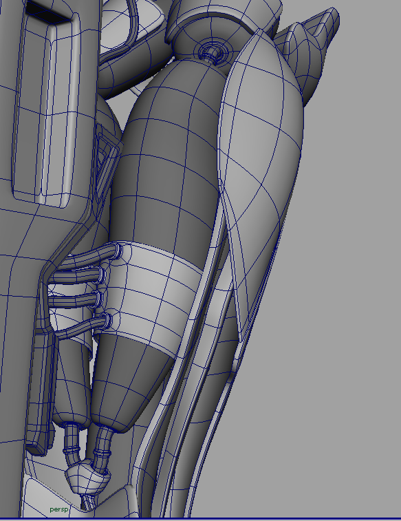 Vaya no, a ver, la mayoría de las piezas son curvas, líneas que delimitan la forma esencial de la pieza, que luego he juntado para formar una pieza Nurbs, estas piezas Nurbs se editan de una forma distinta a la edición poligonal, digamos que trabajas con formas más blandas, no sabría explicarte, para mí es mucho más fácil para poder hacer la mayoría de las piezas de este robot, ya que tiene muchas zonas con formas redondeadas.