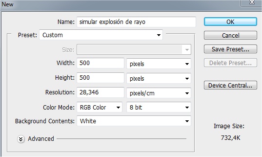 Abrimos un nuevo documento de Photoshop, creando un archivo con las opciones de la imagen y pulsamos ok.