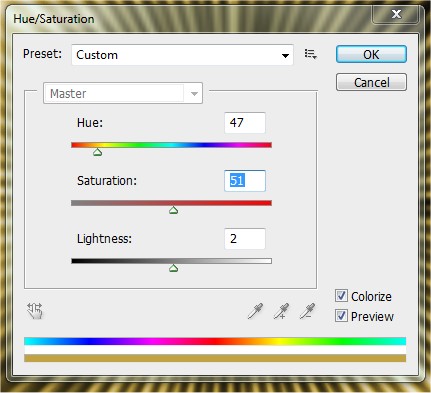 Ahora vamos a pintar con imagen / ajustar / tono-saturación, y le damos los valores de la imagen siguiente, lo primero es marcar la casilla colorear y vista previa, así podremos ver los cambios antes de aplicarlos: