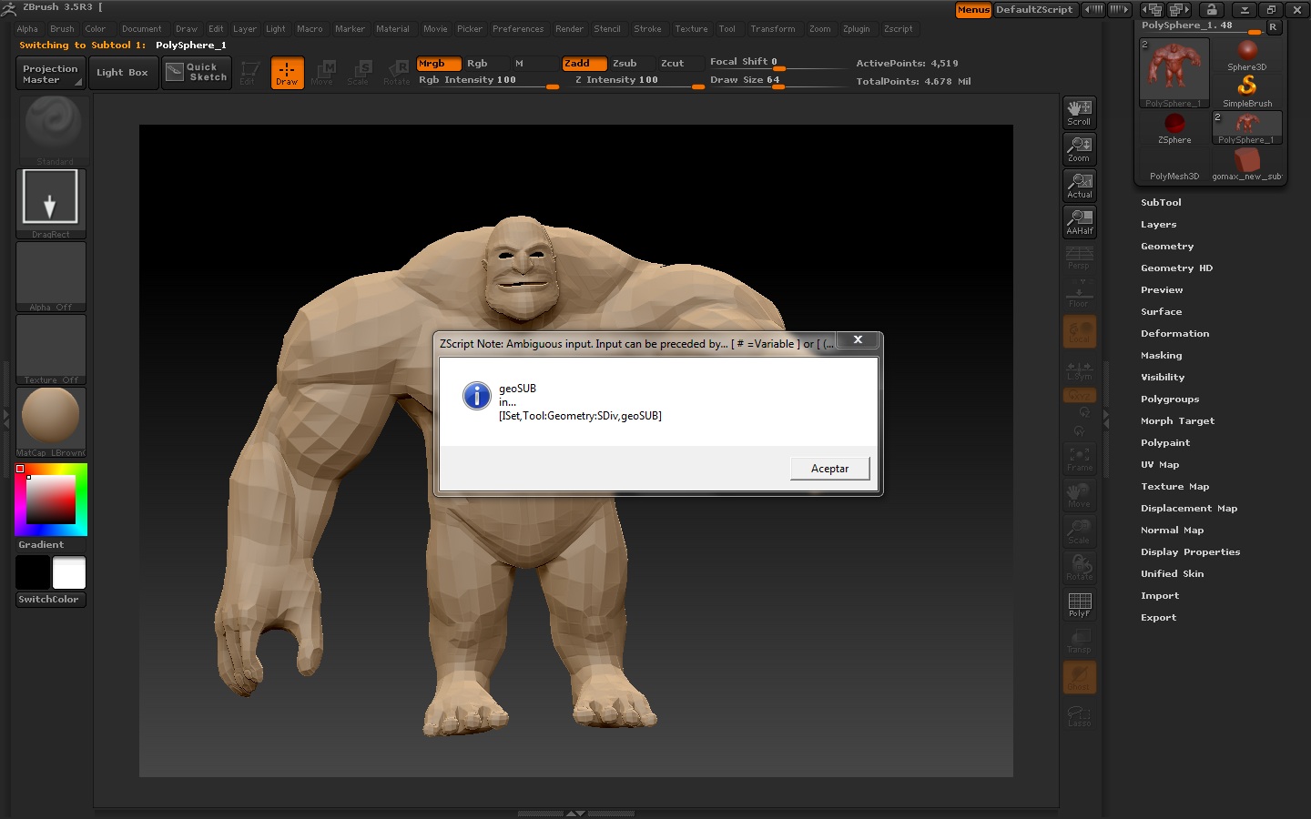 Por otro lado, cada vez, que pruebo el susodicho plugin con un personaje mío o incluso con una simple tetera, el resultado es el mismo siempre, y es que se queda importando indefinidamente, como si no terminara de cargarlo, me sale una ventana chunga en ZBrush(imagen 3) que es donde yo creo que está el problema, pero, la pregunta es, que coñ.pasa?