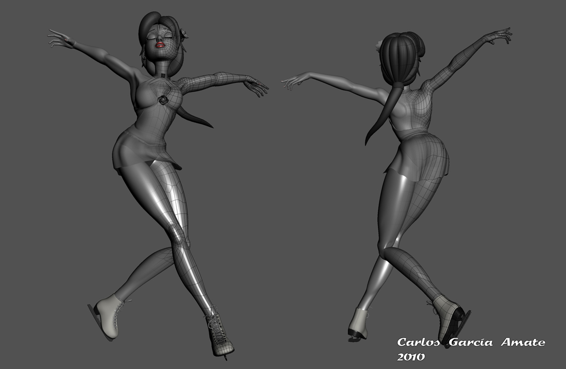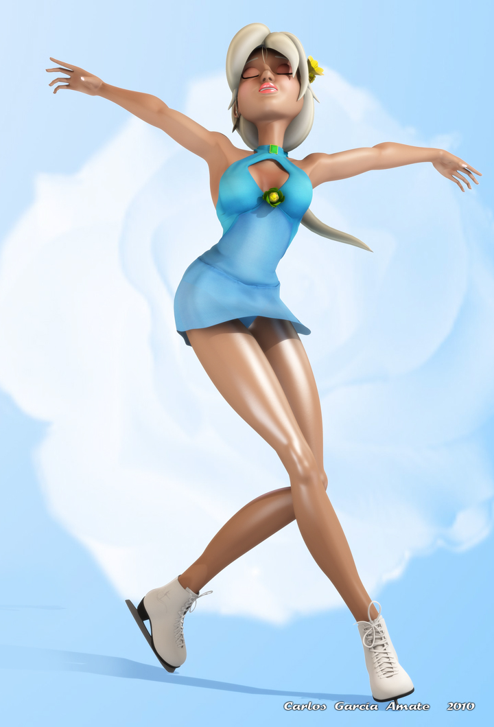 Me gustó mucho, solo unas cosas para tener en cuenta: En la segunda fotografía las manos se ven muy rígidas, habría que cambiarles un poco la postura, pero lo más grave me parece que está en las piernas, son muy largas, por ejemplo, en la primera imagen se ve como va subiendo en volumen y se corta y empieza la cola, pero muy chiquita en relación a la pierna, y en la segunda imagen se ve como la pierna es muy larga en comparación de los brazos estirados que parecen muy cortos, o tal vez sea el vestido muy corto lo que me pueda dar esa sensación, y por último la piel tiene mucho especular, pareciera como si fuera una muñeca, por otro lado, la princesa de hielo no tiene en ningún lado hielo, no mentira, es un chiste. (pero podría estar parada sobre hielo, con algún bonito material con algún Bump y reflect).