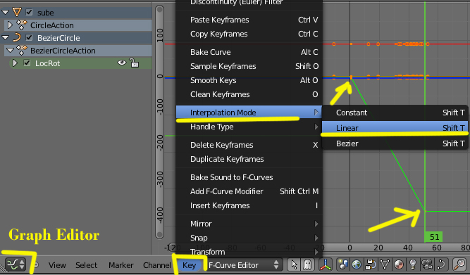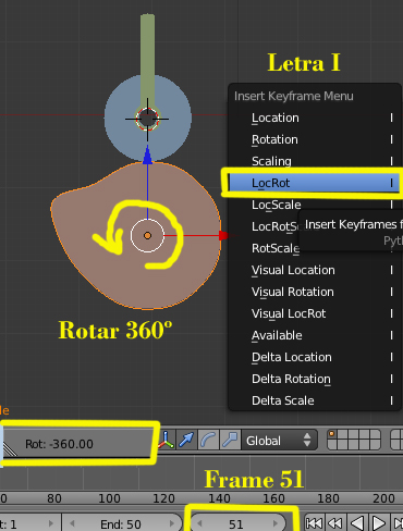Luego cambias al frame 51 y, rotas el objeto en dirección contraria a las agujas del reloj (en este caso) hasta que en el marcador de la barra te marque -360 (si lo haces con la tecla Control presionada, te lo hará de 5 en 5.