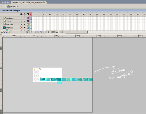 Buenas a todos. Estoy intentando ampliar la galería de imágenes que hay en la página del estudio en el cual trabajo, www.animatikfilms.com. El caso es que necesito añadir unas cuantas más imágenes en el slider de debajo. Todo controlado. Simplemente, como es una tira de imágenes bastante grande, se salen del área de trabajo, es decir, tengo el área visible del documento, y más grande el área de trabajo de flash. ¿sabéis cómo puedo ampliar este área de trabajo, para poder así añadir más imágenes? Os dejo una imagen explicativa.