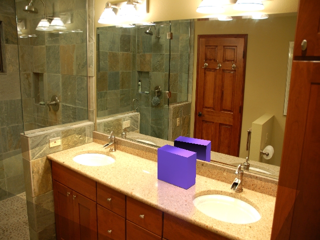 Buenas a todos, tengo un problema con Vray. Estaba probando las diferentes posibilidades que tenía integrar elementos en 3d en una imagen. Mi propósito es hacer hacer una caja se refleje en el cristal y el mármol en esta imagen: