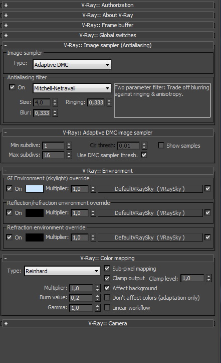 Les dejo mis renders mi PC es Core i5 64bits 8 Gb Ram Vray max 2011 Vray 2.0 utilice gamma del 3dsmax y Vray Sun con 1.0 de intensidad el environment es es Vray Sky copy de los set de render los parámetros los subí en imágenes para que vean en que estoy fallando gracias.