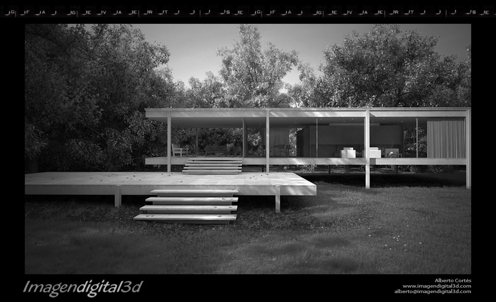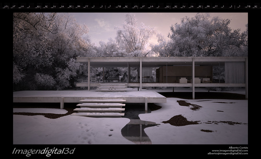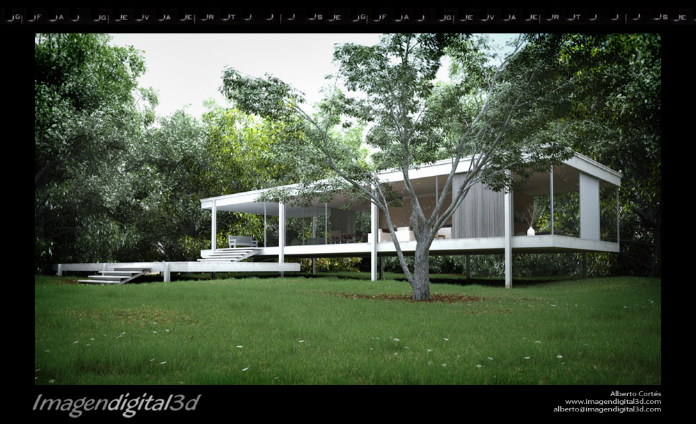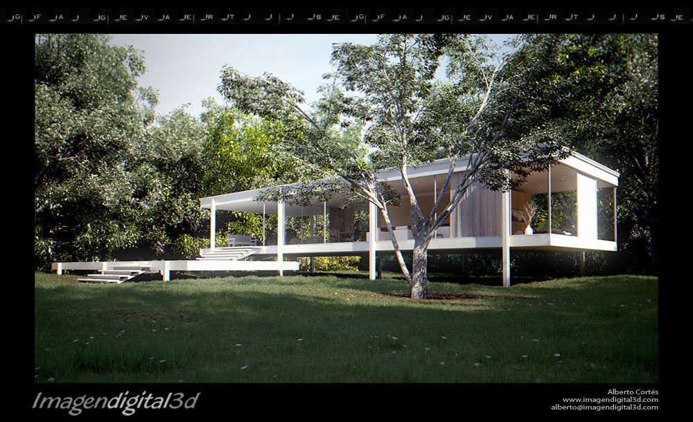 Bueno, aquí mi último trabajo personal en el que llevo trabajando un par de meses. La famosa casa de farnsworth de mies Ludwig Mies van der Rohe.