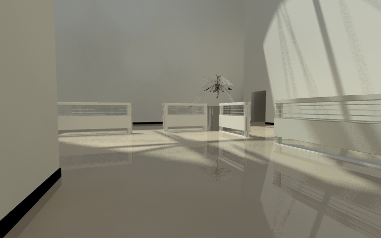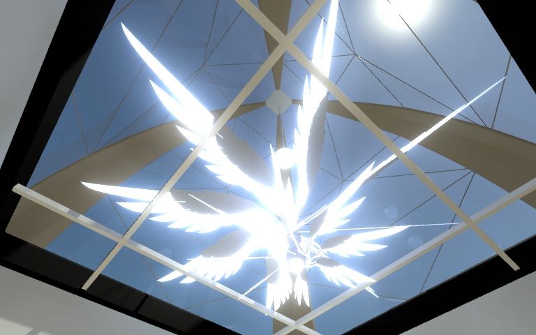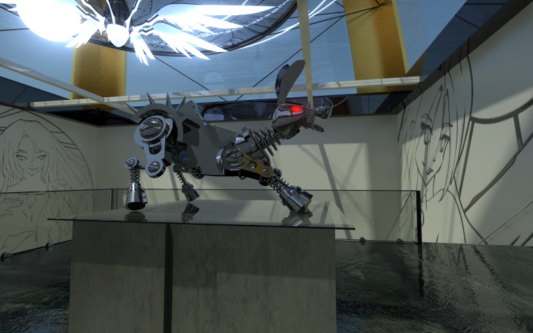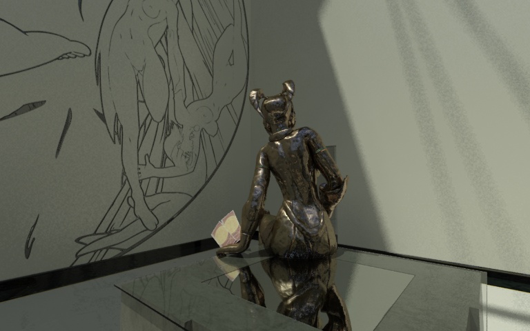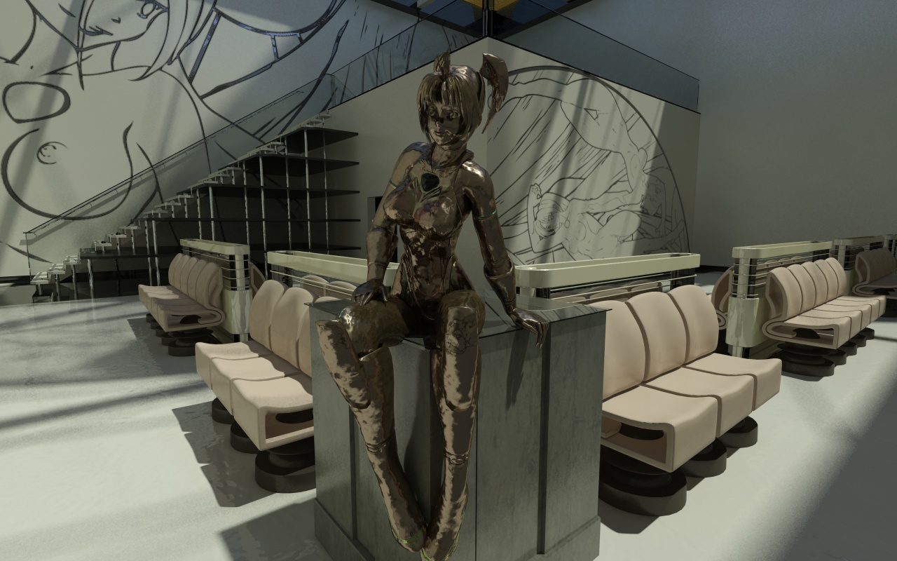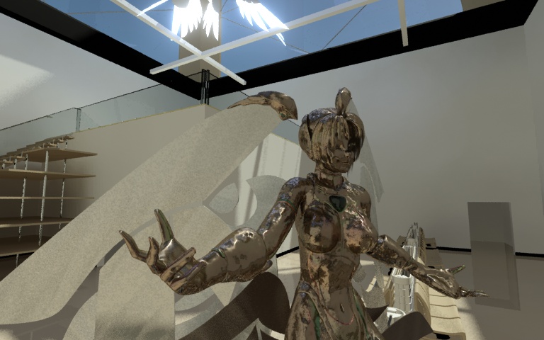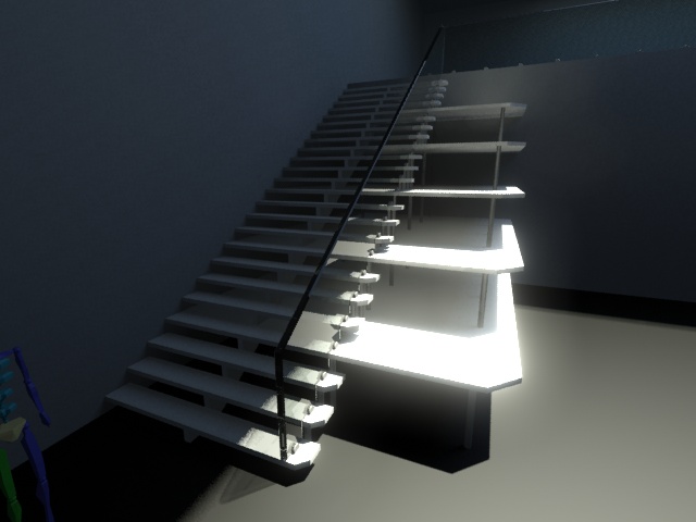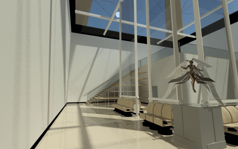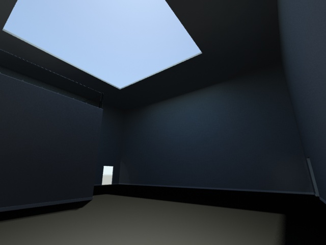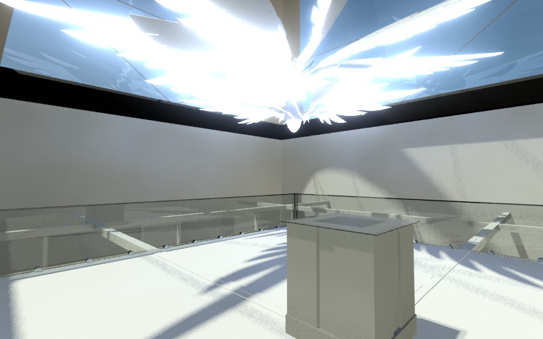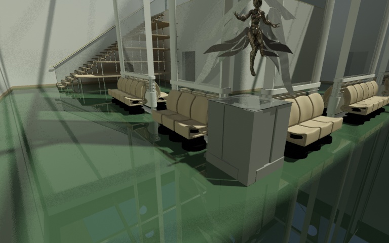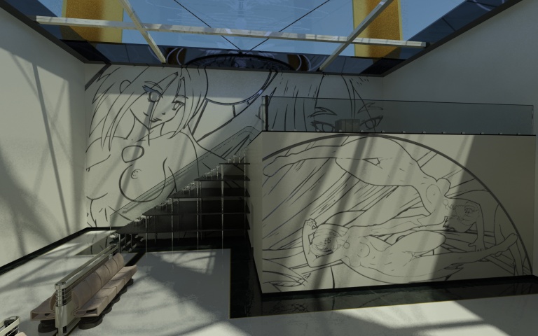 Bueno, esto estaría destinado a ser un pequeño espacio expositivo y constaría de una habitación con una parte elevada a la que se accede por la escalera esa. Salvo lo de cristal no hay materiales aún.