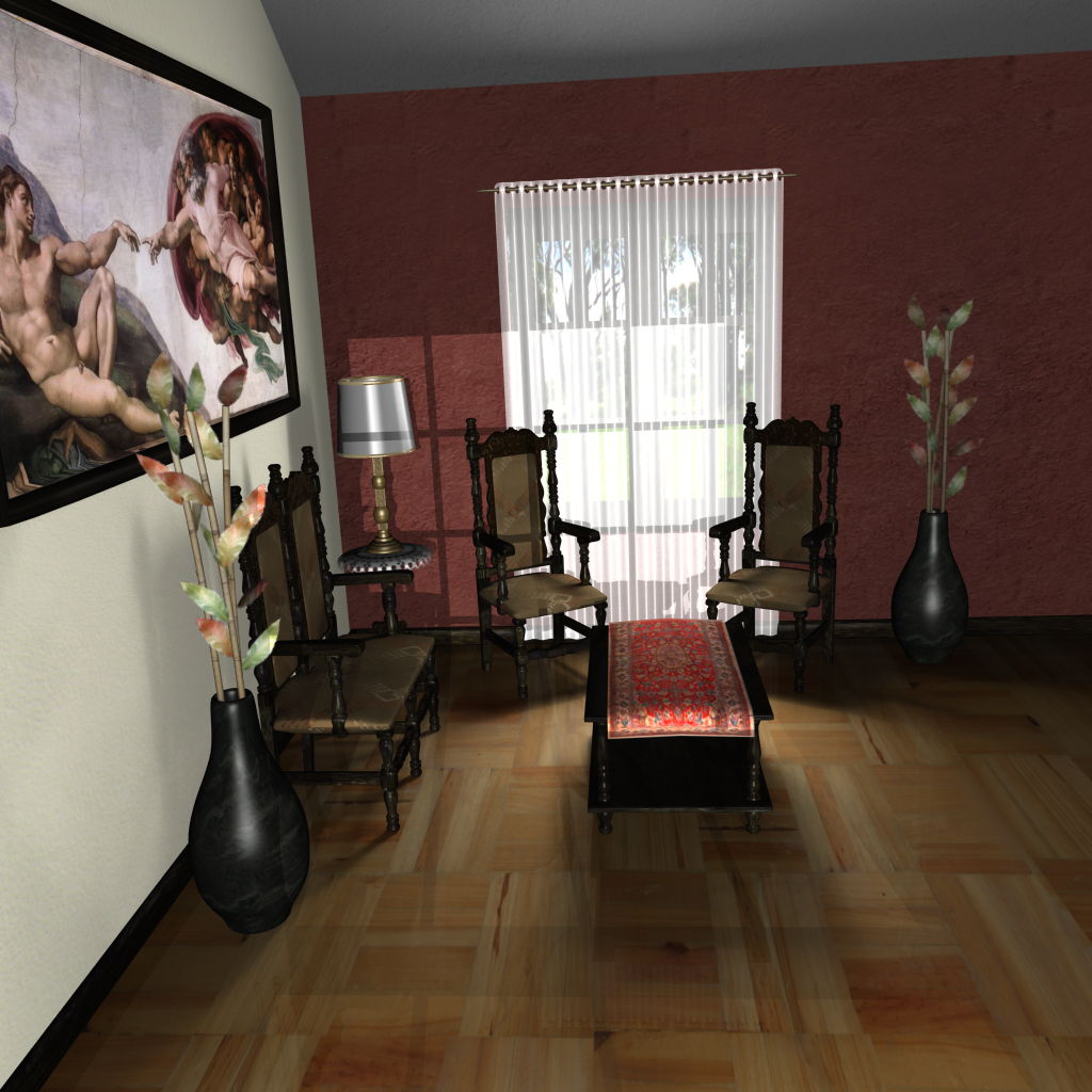 Todos los elementos fueron modelados por mí y las texturas bajadas de internet. Para el renderizado use Mental Ray.
