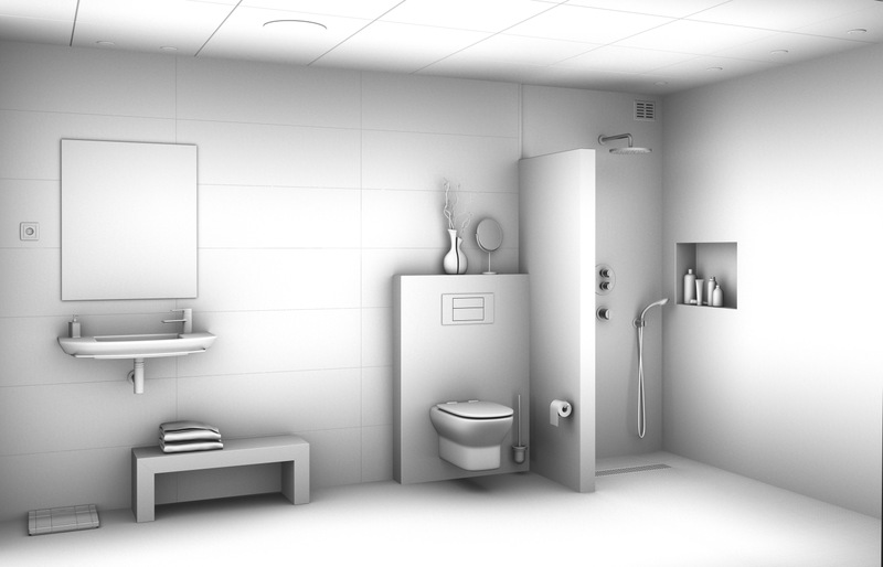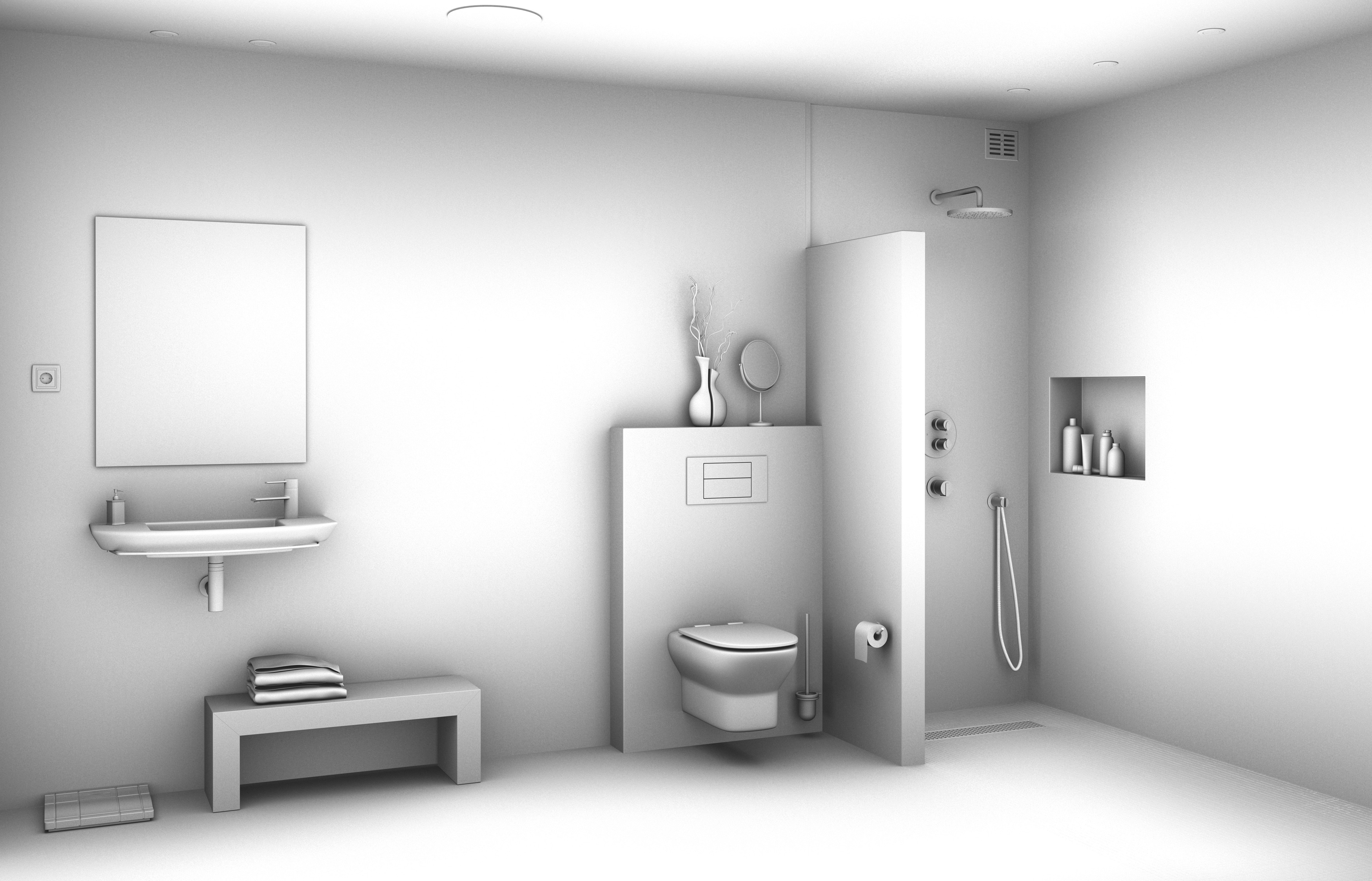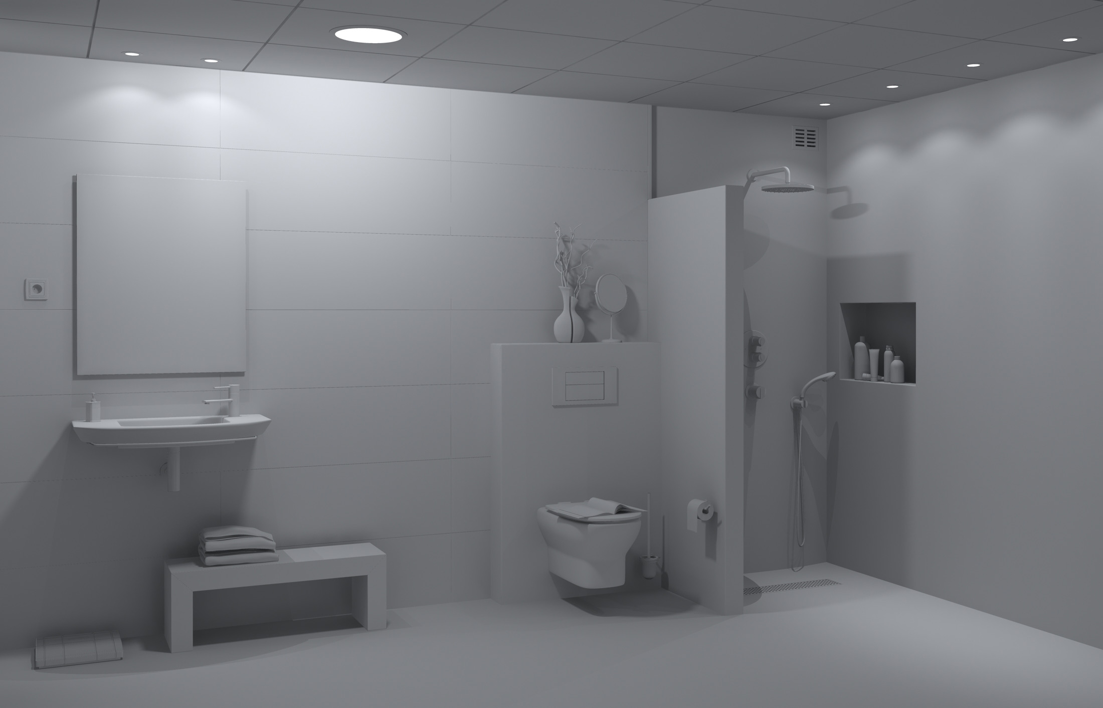Una vez terminado y convencido con la escena, que le queda bastante por el tiempo que tengo, la idea es que salga agua caliente del grifo de ducha (RealFlow) y simular el vaho (FumeFX). Y en las baldosas del suelo huellas de agua de alguien que ha salido pitando de la ducha.