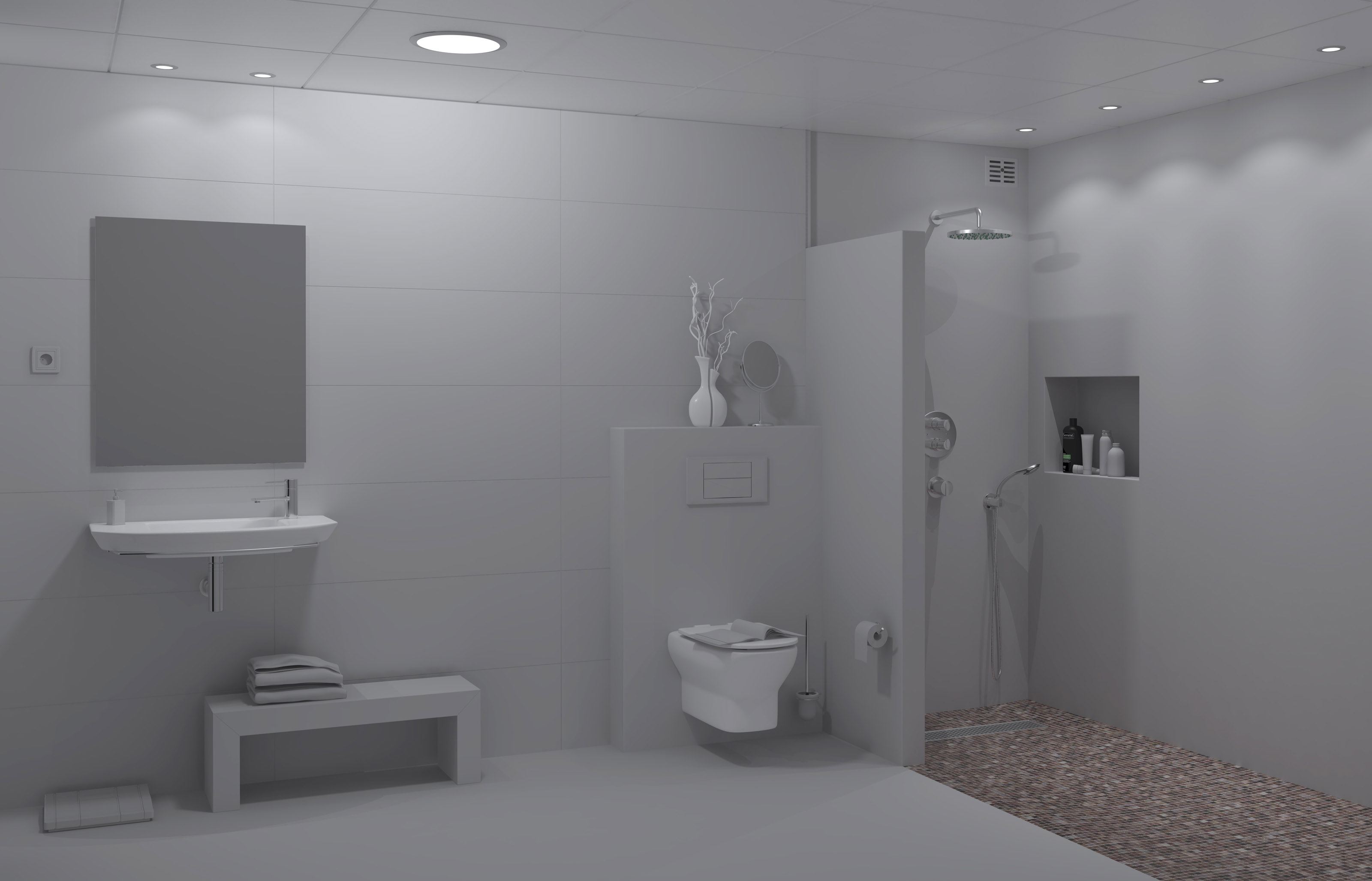 Muy buen trabajo, y buenos materiales. Como dice idearque estaría estupendo ver una versión con luz natural. Sólo una pregunta: ¿por qué son más pequeños los azulejos del suelo con respecto a los de las paredes? Saludos.