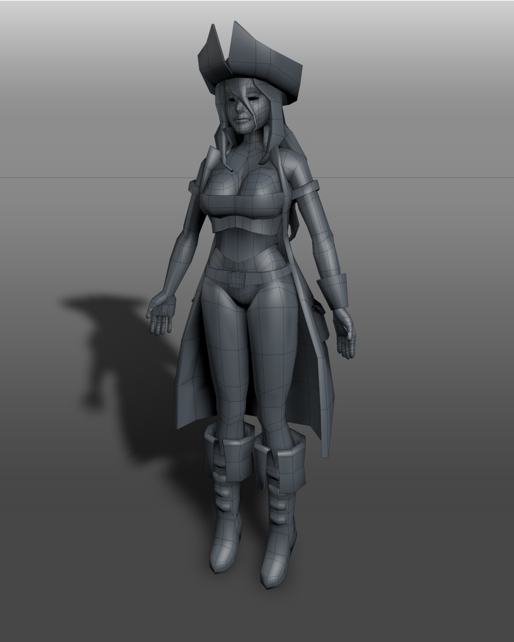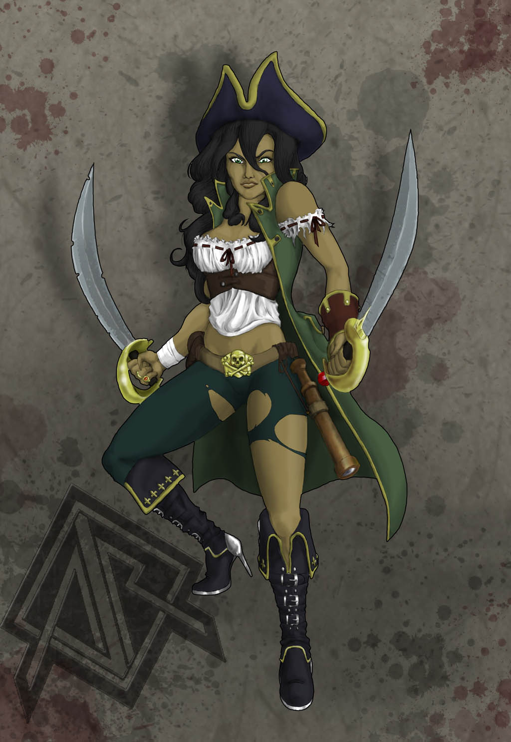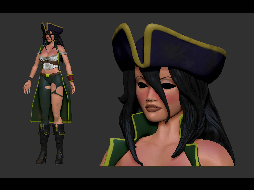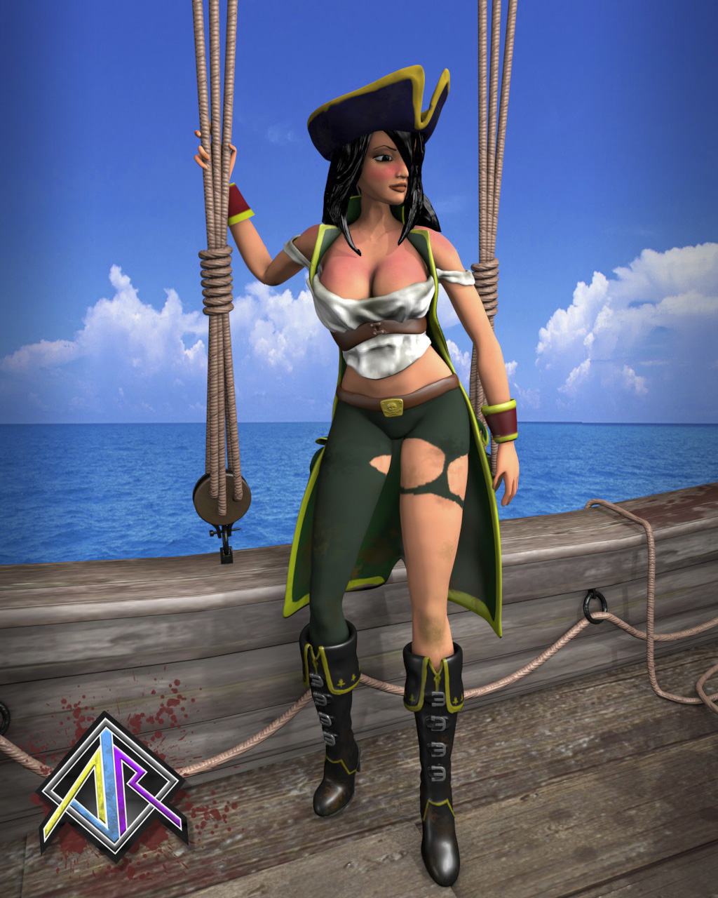 A mí me ha encantado. Me hubiera gustado con una cimitarra en mano que le diera el toque pirata, y un render más dramático como un atardecer o un barco enemigo al fondo, después de todo trae rasgada la ropa, como recién salida de la batalla ¿no? Sugerencias en cuanto a modelado y texturizado no hay, creo que has hecho eso de las proporciones a propósito y ha quedado bien. Saludos.