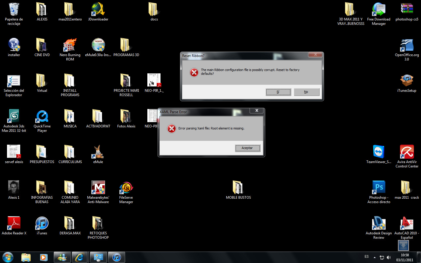 Hola a ver si alguna alma caritativa puede echarme una mano cuando arranco el 3ds Max 2011 me sale estos errores, y cuando estoy trabajando se para cuando le da la gana.
