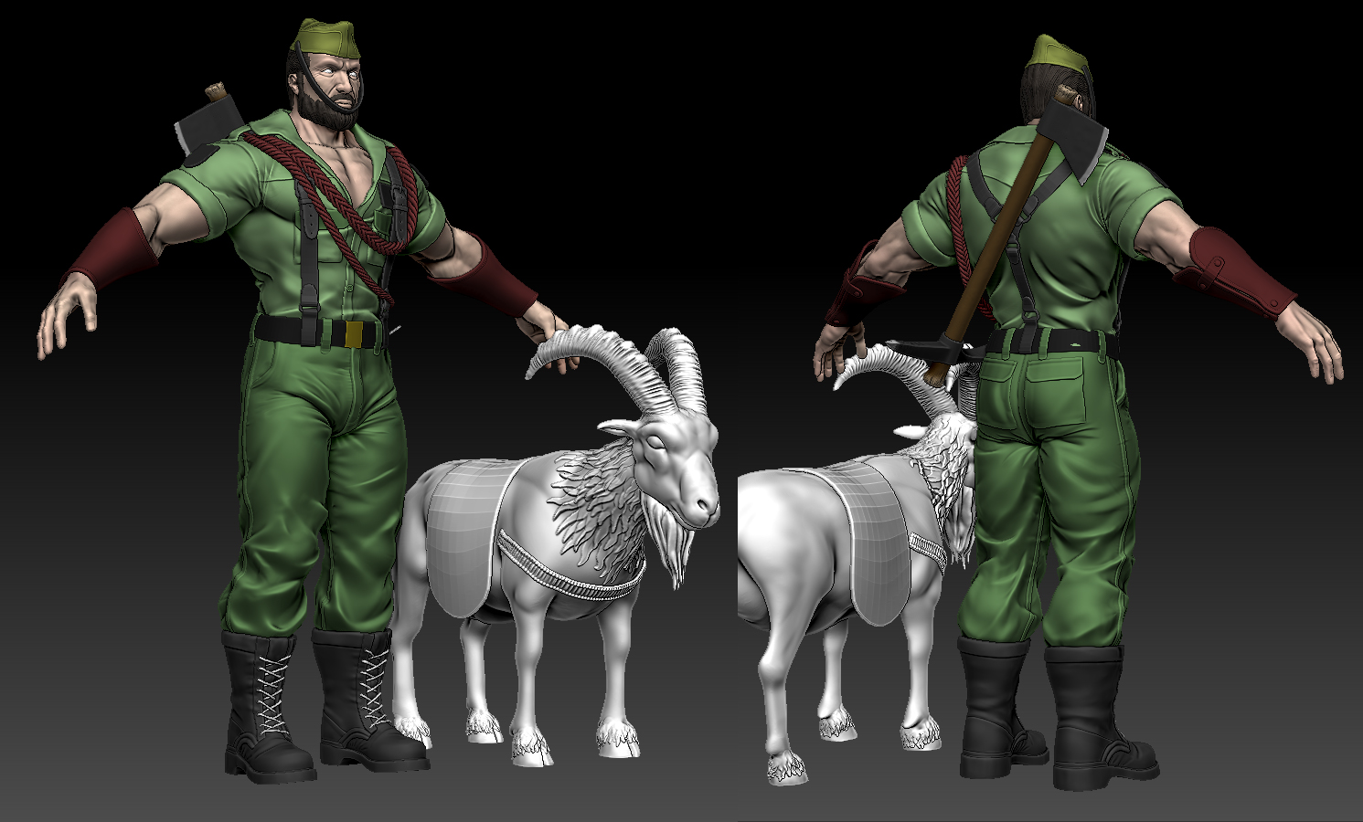 Hola a todos. Este es el último trabajo con el que estoy ocupado últimamente, y la verdad que un poco atascado. El personaje está pensado como su fuera a ser un personaje para algún juego de lucha al tipo de Street Fighter. Va ser un personaje Low poly, había pensado que entre 10000 y 12000 tris para el personaje y máximo 4000 para la cabra que así que, máximo 16000 para los dos en conjunto.