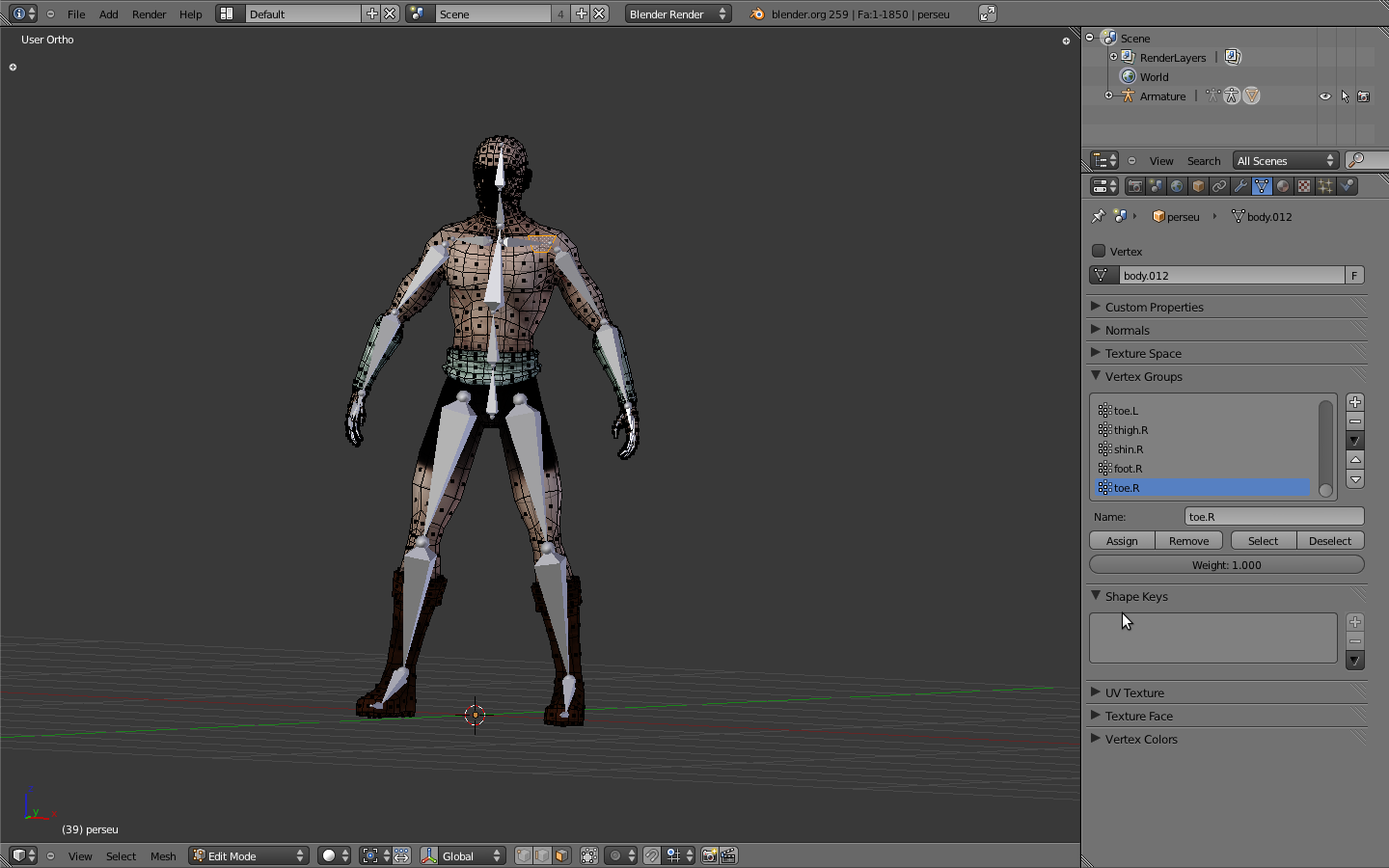 Todo me iba perfecto, hasta que tengo que pesar la falda y el cinturón del personaje. Cuando edito para asignar o quitar puntos de la falda, ésta me desaparece. En object mode la veo sin problemas. Decir que estoy con la versión 2.59 de Blender con Ubuntu 11.10, y es la primera vez que me da algún tipo de problema.