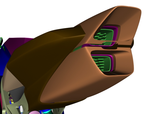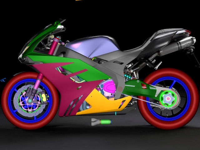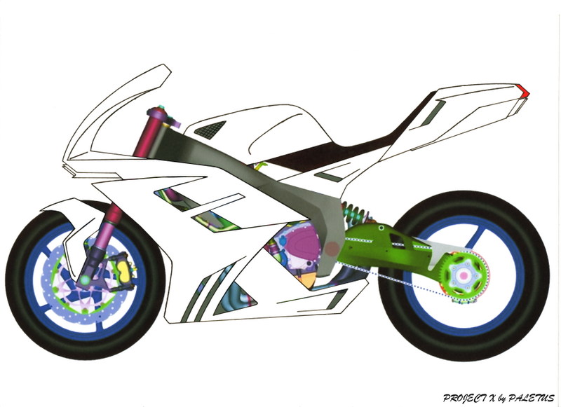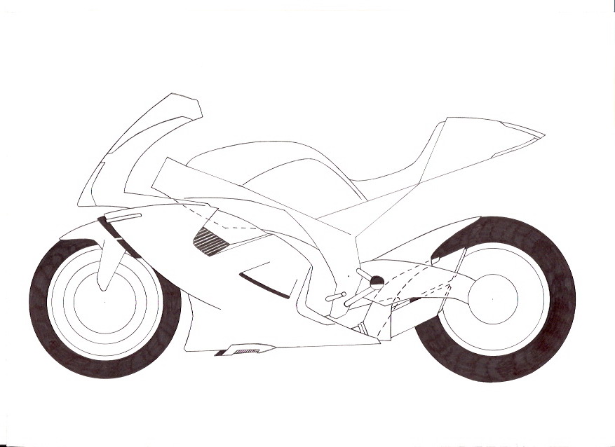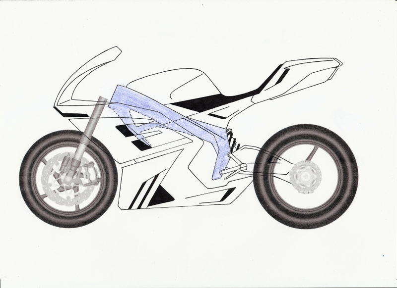 La moto está diseñada desde cero, utilice como muestra para el motor el de la mv agusta 1000, y el resto lo he ido inventado según avanzaba en el proyecto. Se trata de un modelo rr de 1000 cc,4 cilindros en línea, suspensión delantera invertida, monobrazo trasero con amortiguador progresivo en horizontal y tubos de escape por debajo del colin monopoesto, he intentado primar el que sea un diseño agresivo, que asuste al verlo, espero que al final lo consiga, allí por el 2045. Suelo ser muy amigo de diseño futuristas con suspensiones alternativas, pero para mí primera moto me decante por hacer una que fuese viable a nivel de construirla, algo que se pudiera meter dentro de una cadena de montaje.