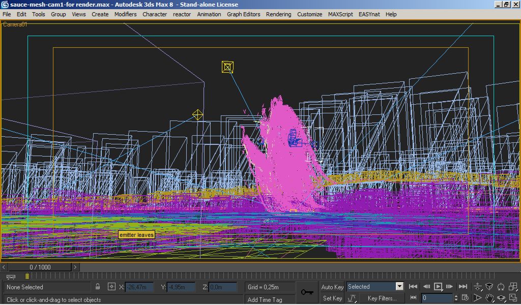 Tres capas interiores logran el underwater, algas (es un plano mapeado) arena en la base (otro plano mapeado) y las hojas flotantes que están hechas con Particle Flow y varios nodos atractores que las concentran a medida que transcurre la animación.