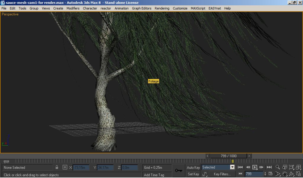 Obviamente las plantas están modeladas en otro archivo. Y están construidas con Shag:Hair. Con ese plugin hago todas mis plantas y árboles, sean estos animados o estáticos.