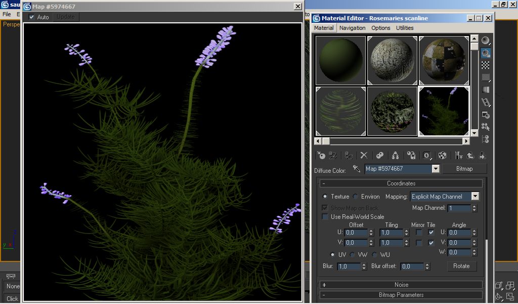 El bosque, así como los rosmaeries al borde del lago son planos mapeados (no son en cruz, sino facing the Camera) los rosemaries son creadas en 3d, hice tres modelos y los rendericé desde varios ángulos y los guardé como mapa tif, luego los planos (sistema de partículas) están mapeados con un multimaterial de 5 variantes. Algo similar hice para el bosque.