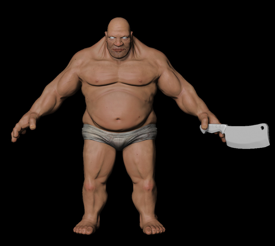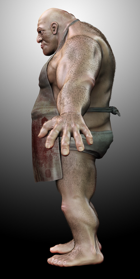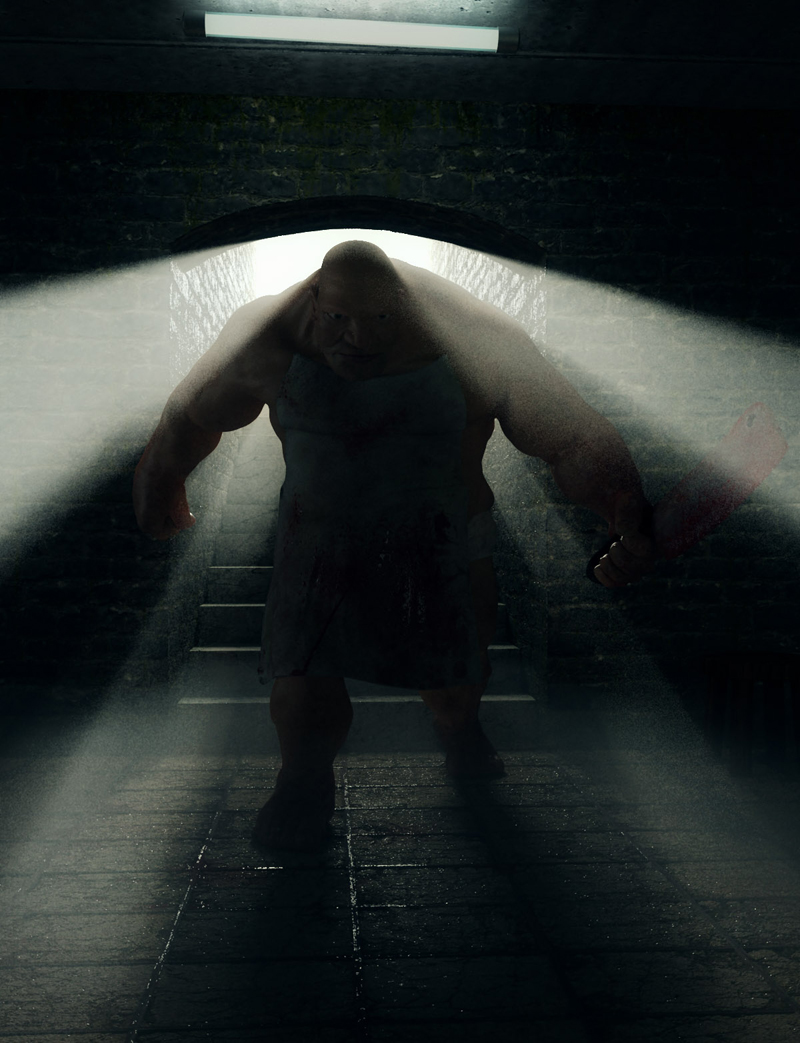 Bueno, he empezado a hacerle un entorno en 3ds Max, una especie de sótano. El carnicero estaría saliendo del arco, acercándose a la cámara. La idea es que, a la espalda le de una luz fuerte, y el tipo quede a contraluz, insinuando casi la figura. Así disimula también un poco la pérdida de detalle al pasar el modelo de ZBrush a 3ds Max.