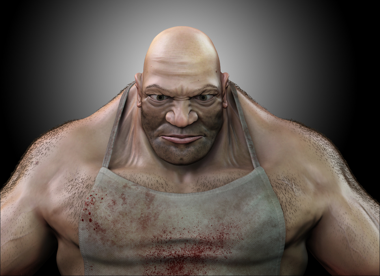 Gracias a los dos por los ánimos. Pongo otro avance. Ya le he hecho el delantal, texturas del machete, los ojos, cambio de tono de piel. Los ojos tengo que revisarlos, porque me da que está un poco chirojo. Le he puesto pelo por el cuerpo, pero no sé si queda del todo bien. ¿Qué decís?