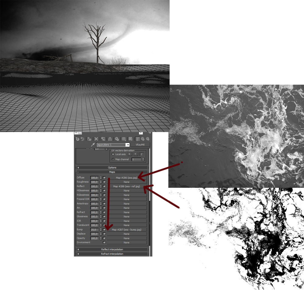 El material es un Vray, pero supongo que, un estándar o Mental será muy parecido. Se utilizan tres imágenes, una en Diffuse que es la que se va a ver, otra desaturada en Bump para darle algo de relieve a la espuma (en mi caso es la misma por que yo lo estoy haciendo en b/n) y la tercera y muy importante es la que va en reflect para que el agua refleje, pero la espuma no, esta imagen es la original desaturada, con los colores invertidos y mucho contraste. En cuanto a la transparencia supongo que, en algunos casos habrá que activarla, pero en este no era necesario.