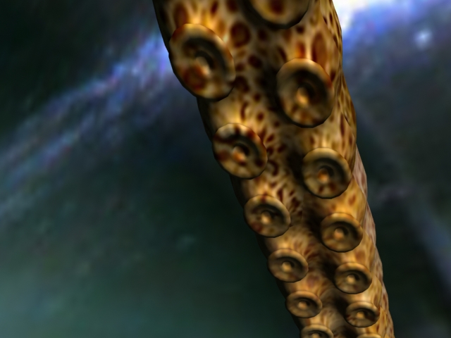 Me falta hacer la cabeza del calamar y texturizar bien. Solo tiene 2 tentáculos porque desde el ángulo en el que se va a ver solo se ven los 2 frontales, los otros puedo agregarlos clonándolos en el fondo.