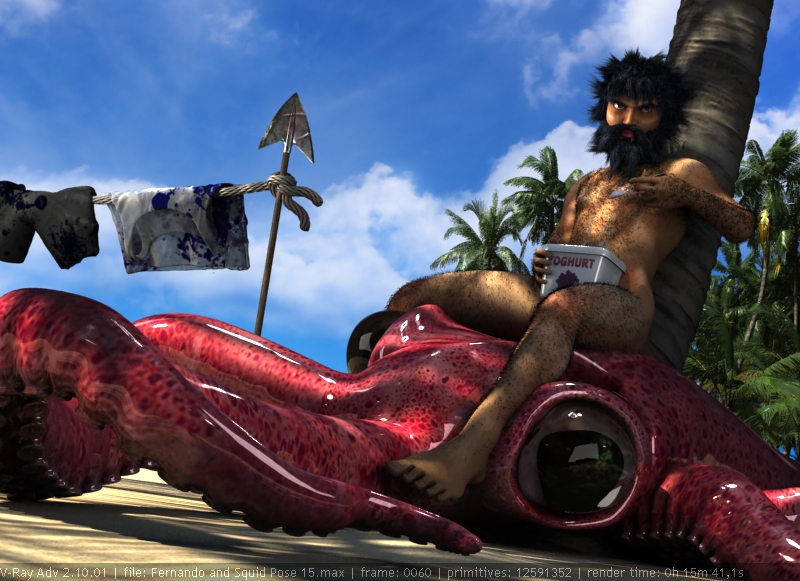 Ok, he seguido trabajando en este proyecto. Que el personaje esté desnudo surgió de un error, ya que la ropas estaban hechas con Cloth simulation, cuando hice el primer render la ropa no apareció y lo subí de esa manera al foro de newgrounds, explicando que no tenía ropa por un error de simulación. Pero la respuesta de todos fue que lo dejara sin ropa que así se veía mucho más cómico.