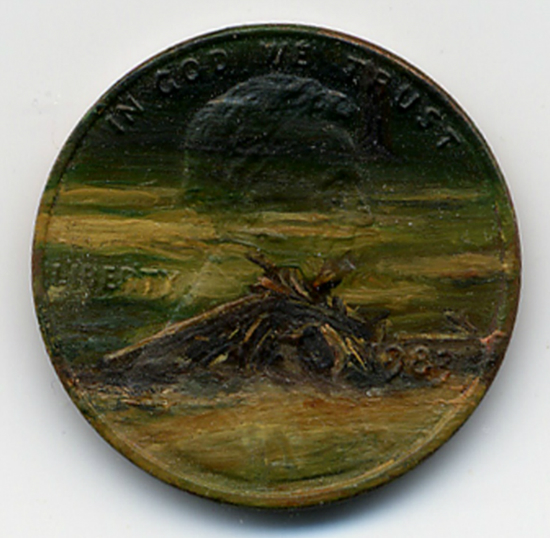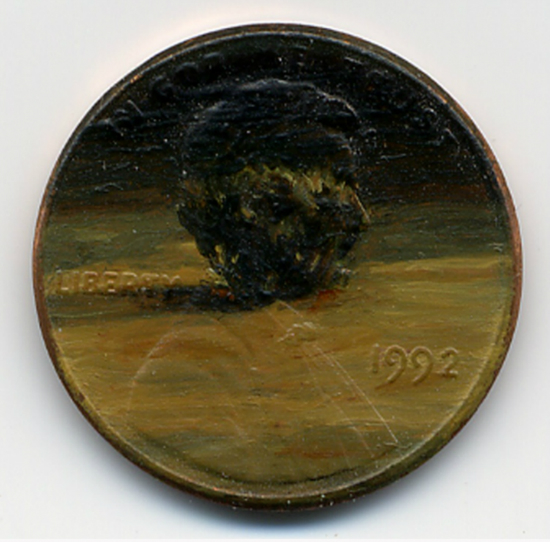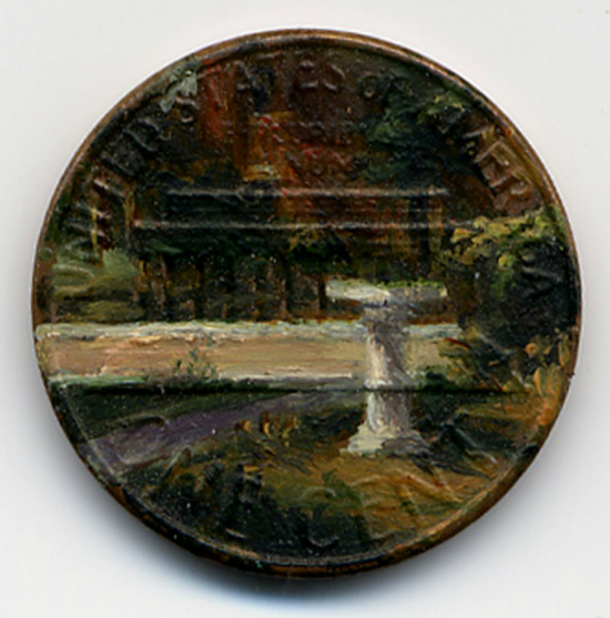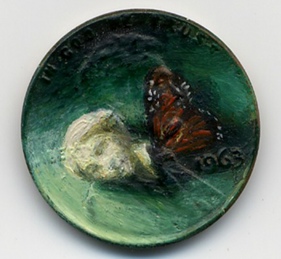 He visto pintar y dibujar en sitios raros, pero este se lleva la palma, sobre todo porque no es garabatear unas monedas, si no, dedicarle arte, esta pintora utiliza las monedas como lienzo, la artista se llama jacqueline lou skaggs.