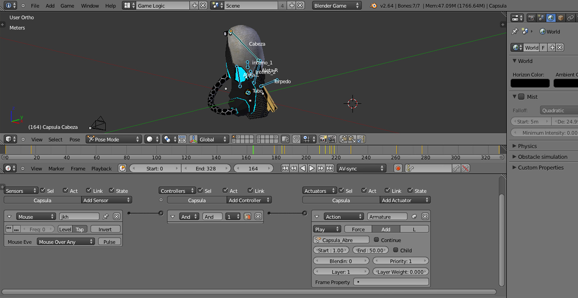 Este problema a pasado varias veces, trato de animar una armature en el motor de Blender sea por medio de un evento always, keyboar o mouse, por lo general sale bien, pero otras veces con los mismos pasos que anime un armature otro no puede animarse, no sé por qué, en este caso solo se anima un solo hueso del armature.