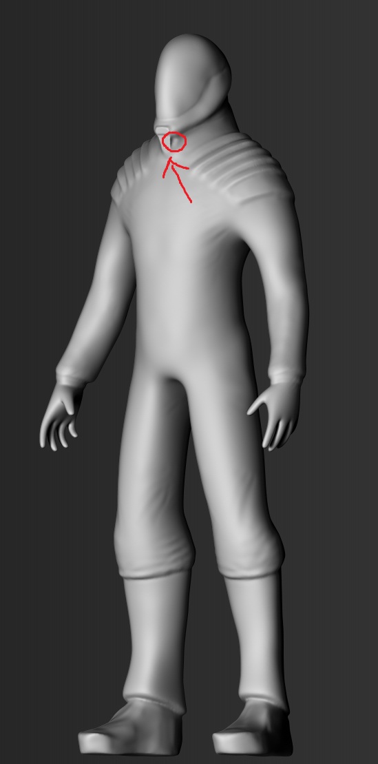 Tan solo que en la pera se ve algo raro es una forma de respirar el problema es que se ve una sombbra y se ve como si fuera una chapa para mantener la cabrza unida con el cuerpo el traje se ve bien y se ve bien.