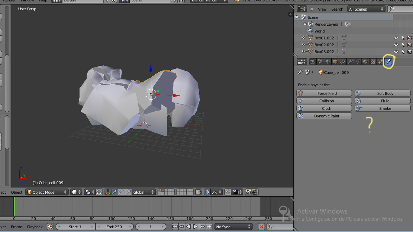 Se presiona p con el objeto seleccionado y empiezan a caer los trozos que ya son cuepues rígidos y cuando quieras que termine, presionas Esc.