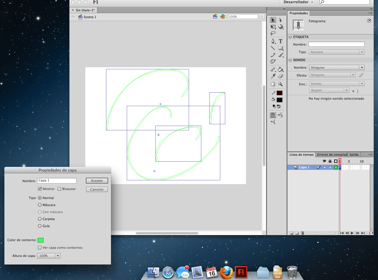 He mirado en la línea de tiempo, pero la opción de contorno de capas estaba activada; así que, desconozco el motivo de que sólo se vea el contorno. ¿Tenéis alguna sugerencia de cómo resolverlo? ¿Existe algún método para reajustar los valores predeterminados en Flash?
