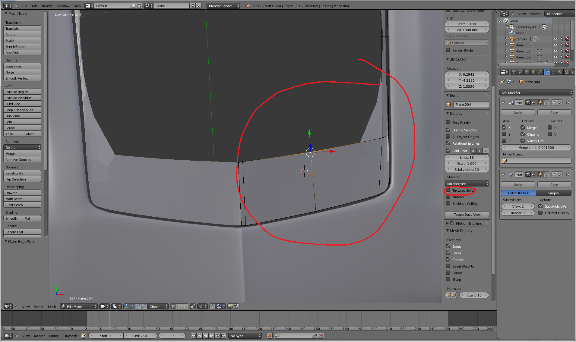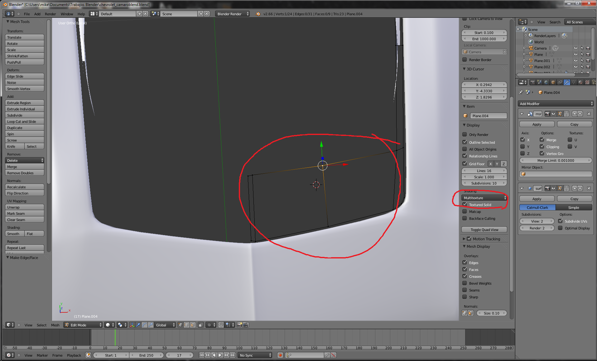 Hola compañeros, tengo un problema / consulta, estoy modelando un carro y utilizo los Blueprints de referencia es por eso que utilizo la opción de Shading > Multitexture > Textured Solid, pero he observado una parte de la malla parece.
