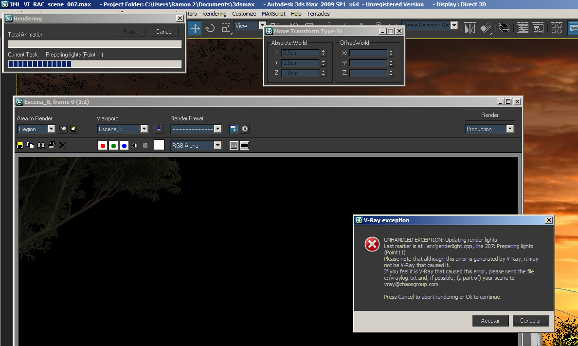 Hola a todos. Cómo están? En esta oportunidad la cuestión es sobre un error que tira el 3D Studio Max 2009 x64 (con Vray Demo 1.5 SP2). Tenía una escena exterior de una casa a la qué quise agregarle un Xref en donde solo tenía un césped hecho con MultiScatter, no Vray Scatter.