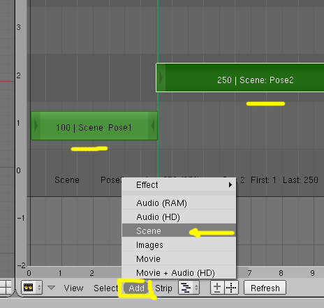 Partiremos la ventana con Split Área y elegiremos el Video Sequence Editor, una vez en el editor de secuencia presionaremos Shift+A, elegiremos Scene (Pose1) poniéndola en primera posición haciendo coincidir los números del 1 al 100.