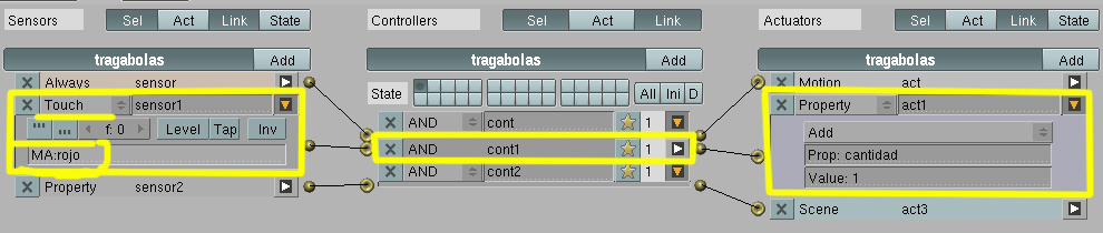 El sensor de tipo Touch, lo que hace, es que cada vez que toca un Material, en el Controller de tipo Property, añade (Add) 1 (Value) a esa propiedad.