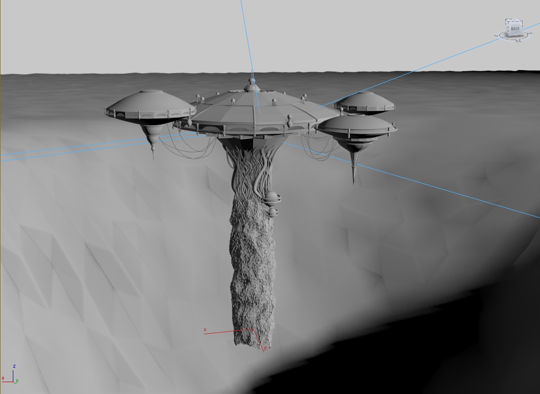 Adjunto un screenshot del render para que puedan verlo. El proyecto consistía en hacer una nave robota como la de Doug Chiang, con sus satélites, cables y demás, flotando sobre una cascada, todo está dentro de una esfera qué tiene como material una textura en HDRI del cielo.