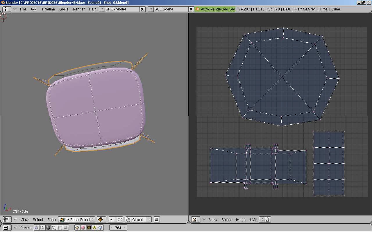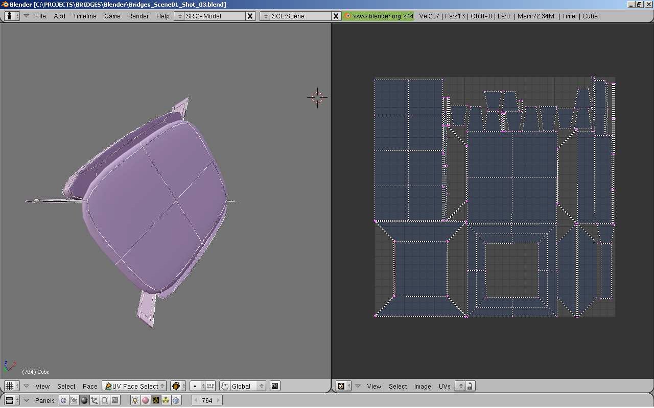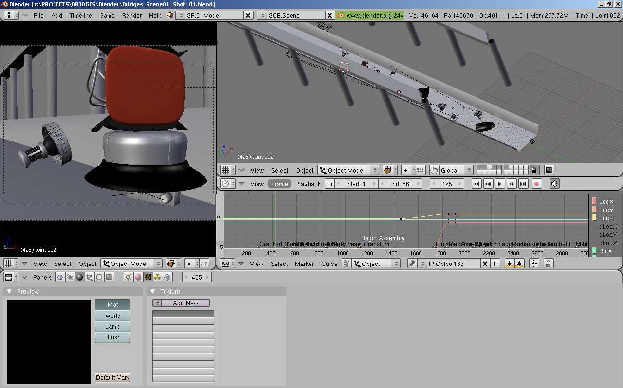 De esta manera pude eliminar cualquier modelo de un SHOT dado que pudiera ralentizar el tiempo de renderizado. Para finalizar, yo aprecio modelos y escenas altamente detalladas y complejas, y el tiempo y las habilidades artísticas se dedicaron a ello. Me gustaría decir no obstante, que dependiendo del disparo, puede ser una pérdida de tiempo y tu objetivo no es únicamente producir arte, sino realizar una producción en una fecha de entrega dada. He visto escenas en ficheros de producción muy grandes con modelos preciosos, pero que eternizan su renderizado. Así pues entremos a texturizar.