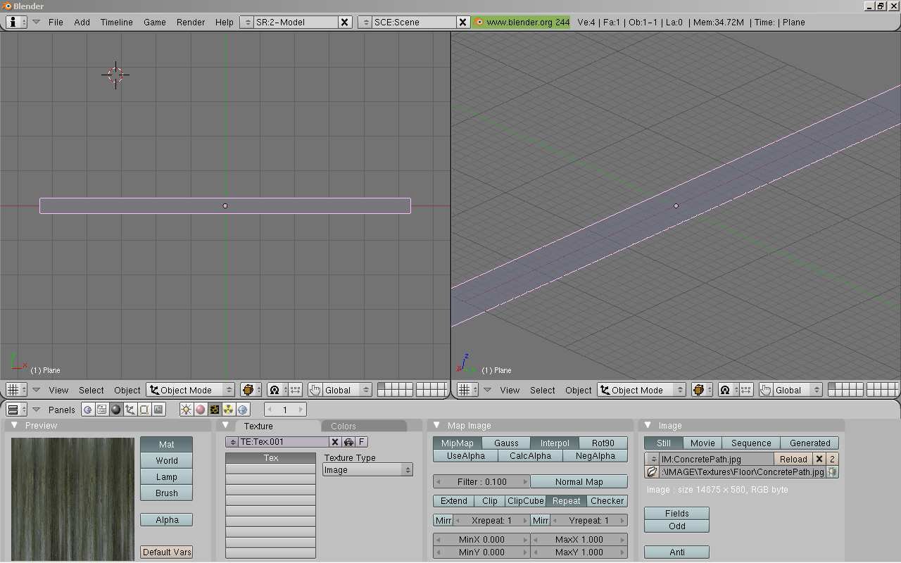 Fui cambiando el tamaño del documento a medida qué iba añadiendo imágenes de izquierda a derecha. Fusioné las dos capas seleccionadas y desactivé el resto. Entonces mezclé los bordes de las fotografías utilizando la herramienta de clonaje en modo de baja opacidad y bordes suaves. Una vez finalicé el ensamblaje del camino entero, lo grabé como fichero JPeG (muy importante hacerlo así si vas a usar YAFRAY).