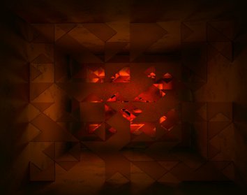 La brillante luz rojo-naranja en el fondo. Éstas estarían para lograr un efecto de estar mirando a la luz brillante a través de una superficie vidriosa. Para tener un contraste decente, manipulé la potencia de las lámparas tal que el gradiente desde la luz a la oscuridad es visible con bastante facilidad sin ningún tipo de post-procesamiento. En ambas imágenes, usualmente la ubicación de las luces esta detrás de varias capas y puede dar a las superficies vidriosas una especie de destello (glow), dando un mejor efecto de atmósfera. En la primera imagen, usé nueve de estas lámparas para lograr que quedase parejo y que no cause ninguna esquina oscura no deseada. También puse las lámparas a esféricas, la razón por lo que hago esto es porque puedo tener una idea de que tan lejos cualquier luz de estas lámparas podría estar. Probé distintos intentos de configuraciones previas incluida mezclar las luces de gran potencia a través de diferentes áreas del corredor, pero el contraste logrado era pobre en algunos sitios, manchas, y no quería eso.