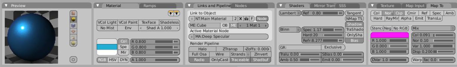El bump map producirá la apariencia granulosa, y el color especular dará al reflejo especular algo de color. Ya qué no queremos nada de difusa, el especular será difundido según el tamaño de la textura y el valor de la normal.