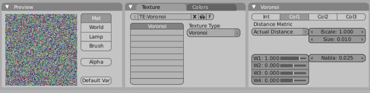 ¿Pero cómo crear la textura de puntitos de luces altasí Como una textura especular, podemos usar el Voronoi seleccionando la pestaña de Col1. Esta textura puede ser usada para él canal de bump map (Mapa de relieve) así como para él canal del color especular.