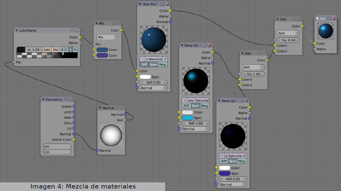 Los dos materiales de reflexión especular son añadidos juntos y el color resultante es añadido junto con el del material del sombreador principal.