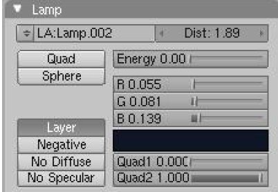 Las luces tipo Área producen una bonita iluminación uniforme y podemos, en cierta forma, controlar un poco la atenuación con la distancia. Vamos a usar esta última. Con un valor pequeño de 0.3 en Dist, coloqué la lámpara ligeramente bajo el suelo. Mientras más la aleje más disminuira la intensidad de la luz. Por favor, tenga en cuenta que en caso de que quiera incrementar el tamaño de la lámpara, use el control deslizante de Size en vez de escalar la lámpara. Si la escala, tendrá también que escalar el valor de la atenuación.