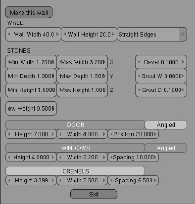 Si no lo consigues necesitas instalar Python. Si eso no funciona necesitare arreglar el script. La encarnación actual te permite crear paredes con o sin ventanas rectangulares, puertas y crestería. El script genera dos objetos mallas, una pared y una lechada.