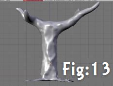 Ahora crearemos la superficie del árbol. Sabias que los baches y espirales se forman con el crecer del árbol? Así que con la brocha draw (tecla D) puesta en tamaño 20 (tecla F) y fuerza en 100 (Shift+F), empieza jalando la brocha arriba y abajo del árbol. Recuerda rotar tu imagen y dibujar por todo el árbol, evitando cruces si lo quieres. Tambie puedes mantener la tecla Shift mientras pasas la brocha para crear grietas y fisuras en la superficie del árbol (figura 13).