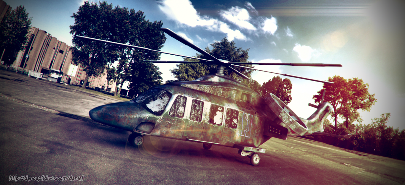 Hola guerero011, ¿Qué tal? Esta chula la imagen como composición el color y escenario, pero me falla mucho el material, se ve que es un material viejo, antiguo, oxidado con lo que no debería de tener esa cantidad de brillo dejaría más mate y no le daría tanto bump, al igual que los cristales si es viejo es viejo todo yo los mancharía para qué quedará más acorde con el helicóptero. Saludos.