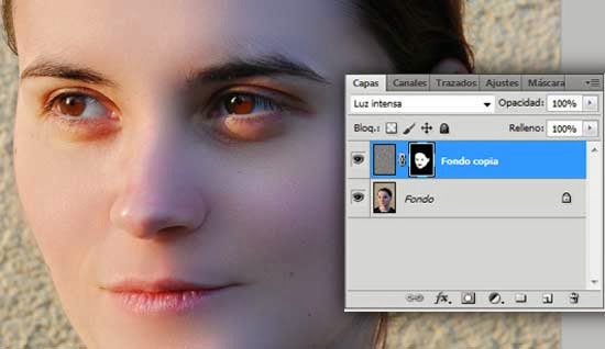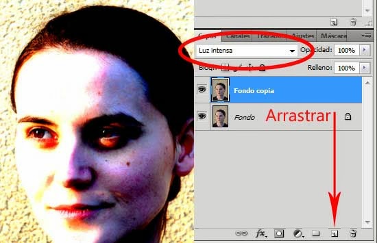 En primer lugar, duplica la capa de fondo. Basta con arrastrar la capa al icono de nueva capa en la parte inferior derecha de la paleta de capas. Ahora establece el Modo de fusión de esta capa recién creada en Luz intensa.