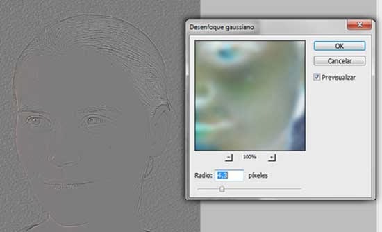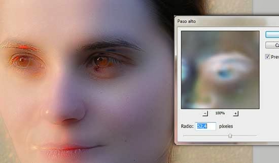 Vamos a suavizar la piel para ello ir a Filtro/Otros/Paso Alto. Mueve el control deslizante hasta que estés satisfecho con el suavizado. Puedes notar que la zona de alrededor de los ojos queda un tanto extraña, simplemente ignorarlo por ahora. Concéntrate en las mejillas, la frente y la nariz.