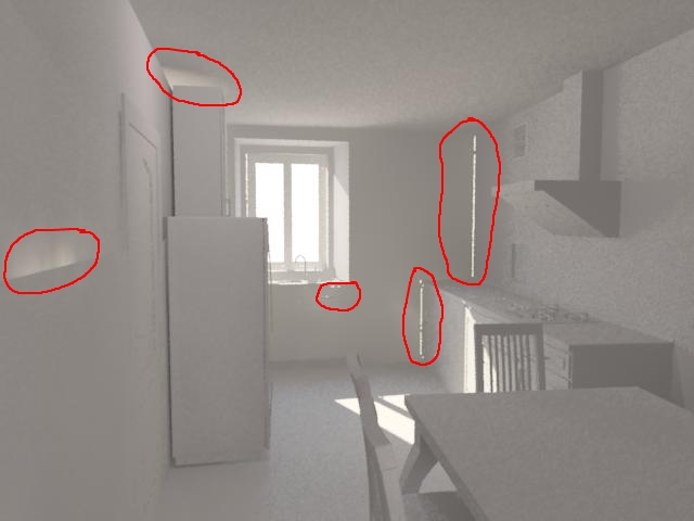 Al renderizar, aparecen zonas iluminadas en las uniones de las paredes y en algunos muebles cerca o en contacto con las paredes.